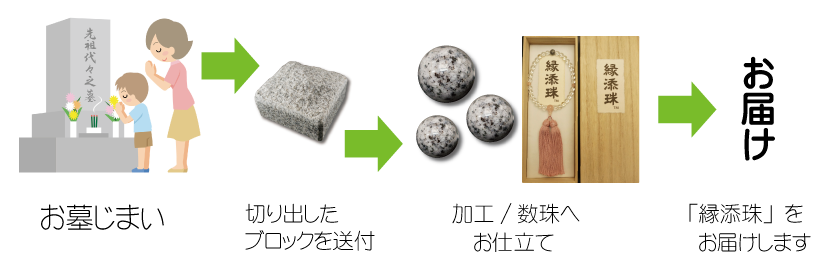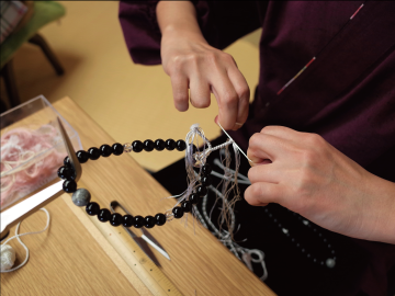 京念珠製造師が組み上げる数珠「京念珠®」 長年に渡って数珠を製作する「京念珠製造師」が、出来上がった玉と上質な素材を使用し、数珠作りの伝統技術で 縁添珠 をひとつひとつ組み上げます。 |